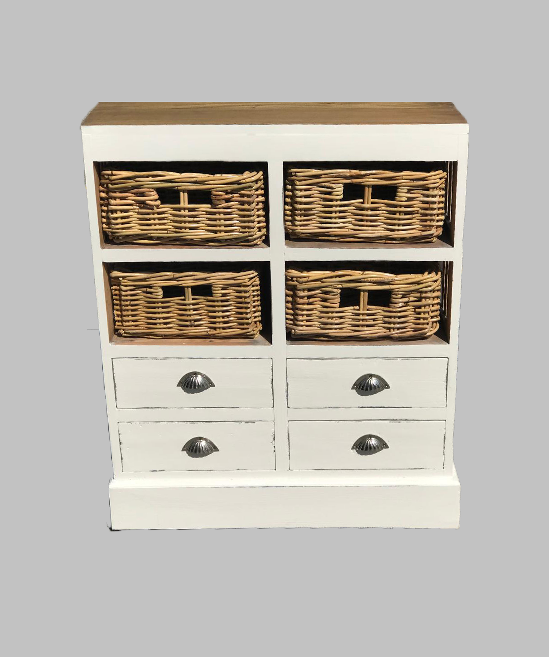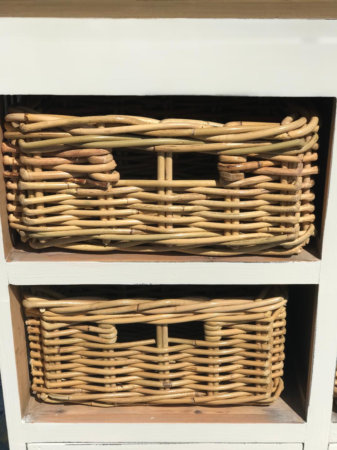 This beautiful Genice Storage Cabinet features four drawers and four wicker baskets. The combination of the light wood colour and wicker baskets give the cupboard a lovely rustic feel. Made from Mahogany timber.