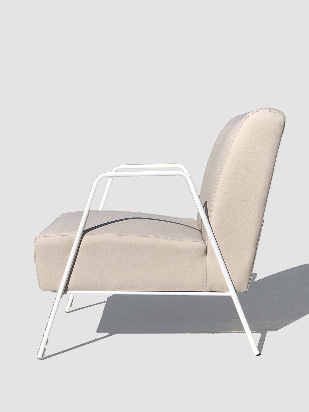 Arm chair made with white metal frame. Seat cushion made from high density foam and linen-look fabric. Available in 3 colours - Beige, Grey and Green.