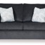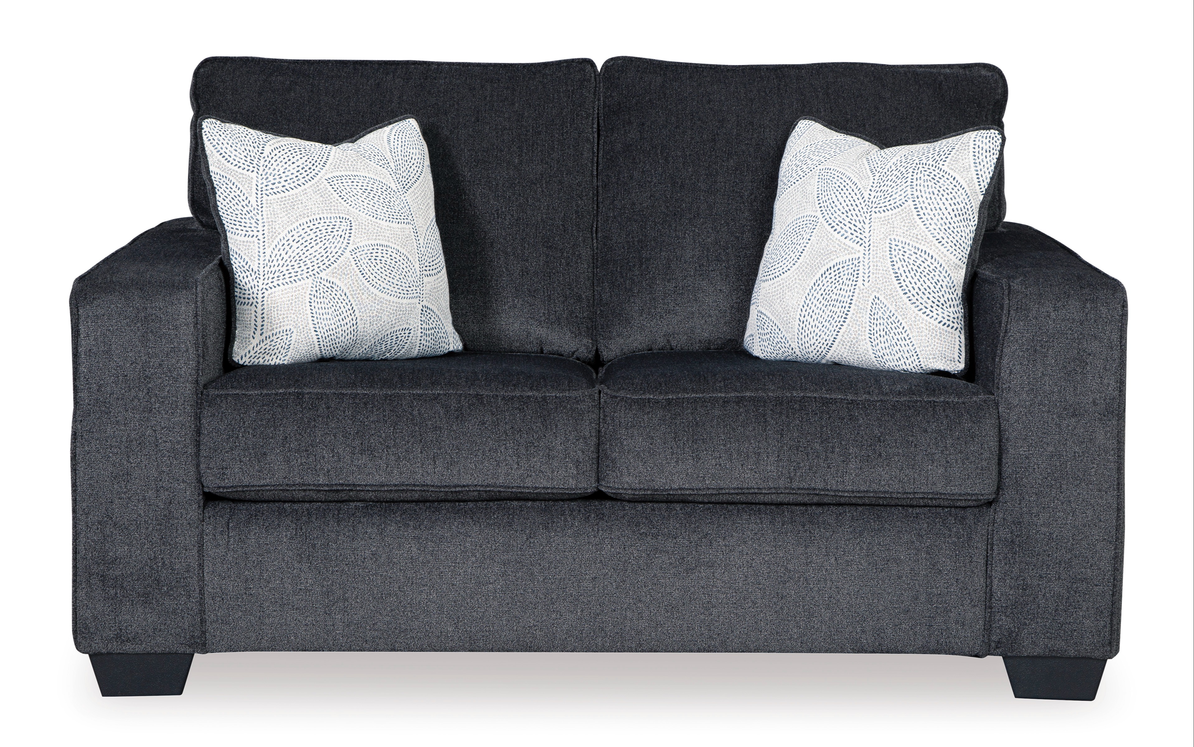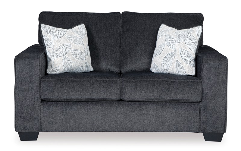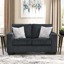 When style is the question, this stunning loveseat provides the answer. With its clean lines and sleek track arms, the contemporary design is paired with plush cushioning and a chenille-like upholstery that's incredibly soft to the touch. Finished in a versatile slate, this loveseat effortlessly complements a wide range of color schemes and comes with two subtly patterned floral pillows for a fresh, stylish touch.