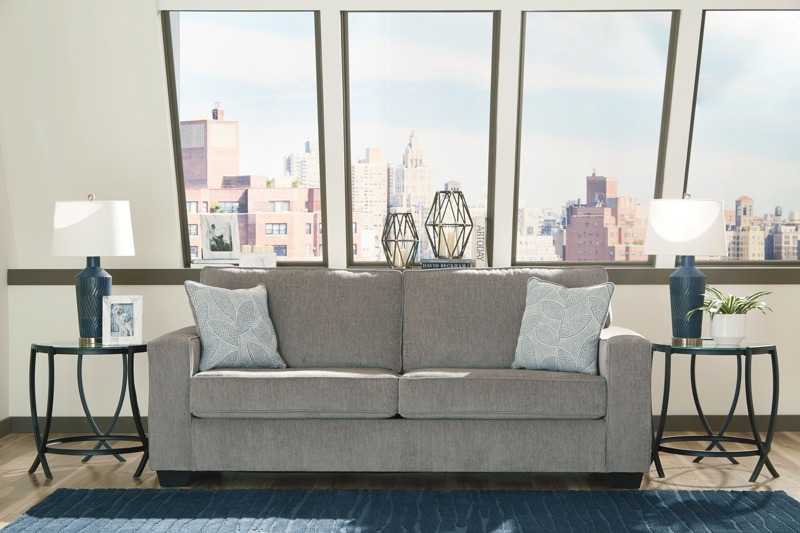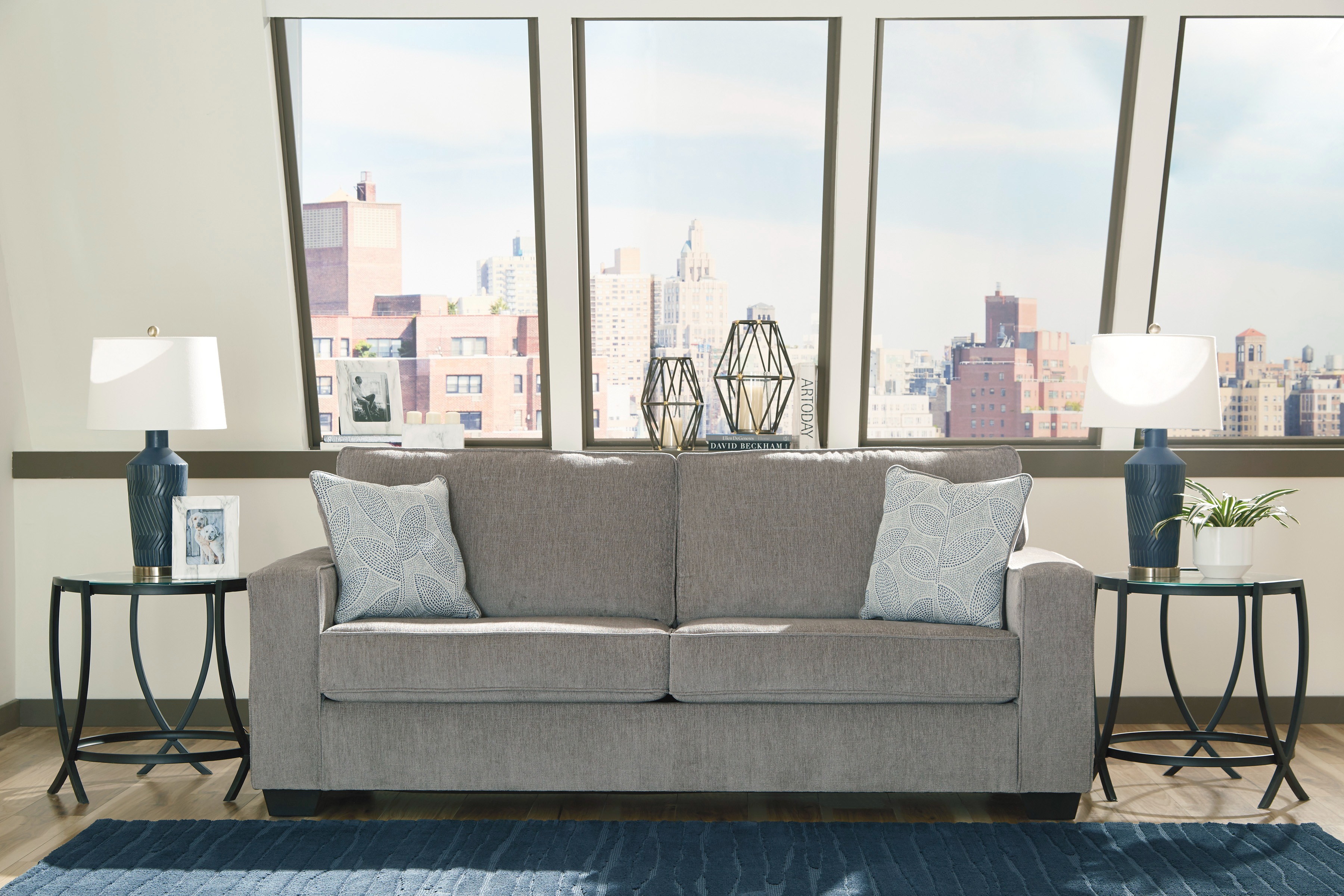 If style is the question, then this striking sofa sleeper is the answer. Sporting clean lines and sleek track arms, its decidedly contemporary profile is enhanced with plump cushioning and chenille-feel upholstery that's so pleasing to the touch. This sofa sleeper in a richly neutral alloy is sure to complement a variety of color schemes, while the understated floral-patterned pillows bring a fashionably fresh appeal. The pull-out queen mattress, crafted from quality memory foam, comfortably accommodates overnight guests.