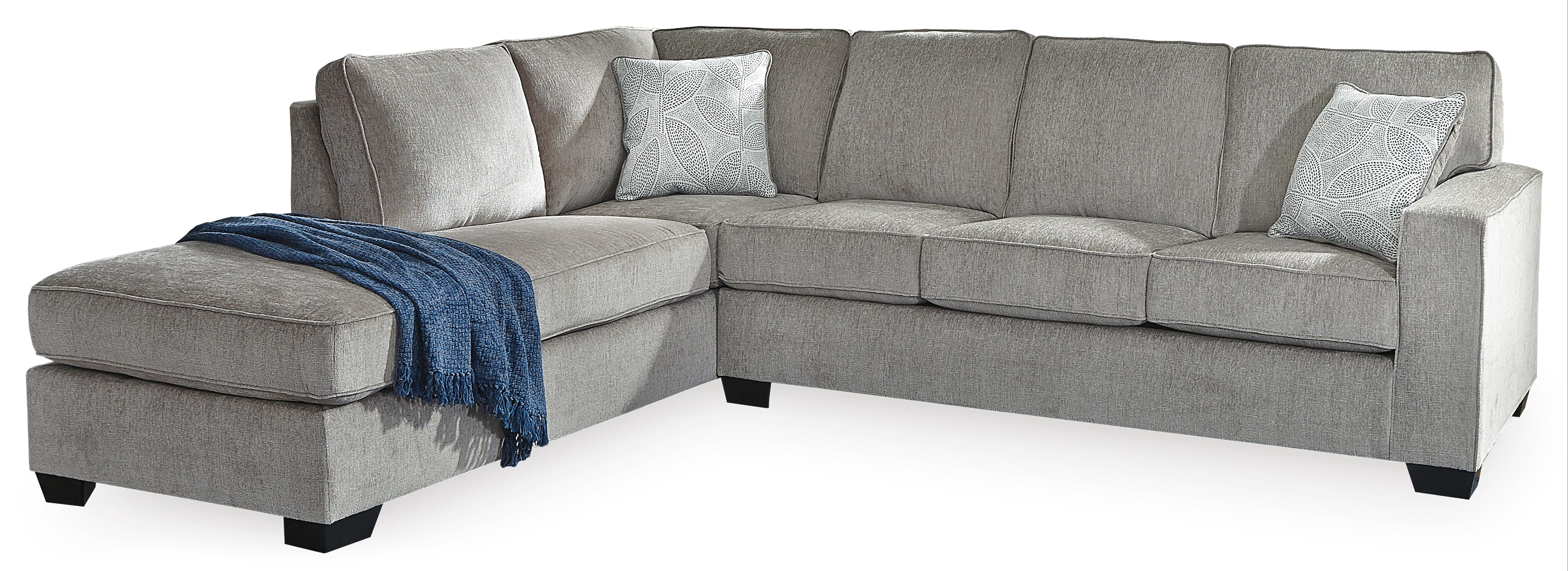 If style is the question, then this sleeper sectional is the answer. Sporting clean lines and sleek track arms, its decidedly contemporary profile is enhanced with plump cushioning and chenille-feel upholstery, so pleasing to the touch. This sleeper sectional in a richly neutral alloy is sure to complement a variety of color schemes, while the understated floral-patterned pillows bring a fresh, fashionable appeal. Crafted with quality memory foam, the pull-out full mattress comfortably accommodates overnight guests.