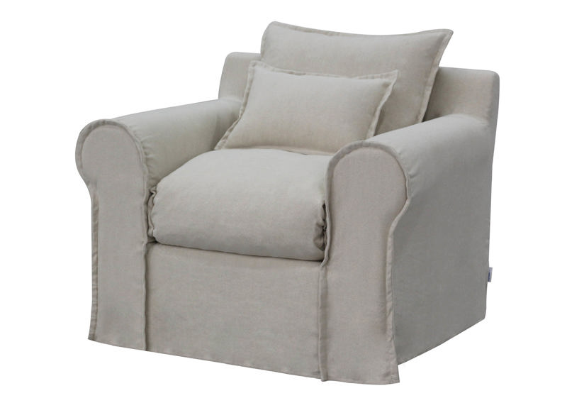 Relax and unwind on the stylish and comfortable Riviera 1 Seater Chair. Frame made from solid timber. Cushions are made using duck feather with a blend of linen and cotton fabrics. Seat constructed with spring system and webbing with 7cm foam.