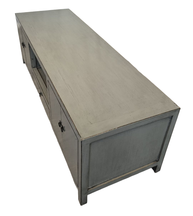 Featuring multiple compartments for media and storage, this piece is crafted from multi-layer board and recycled pine, combining durability with a distinctive, character-rich finish.