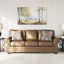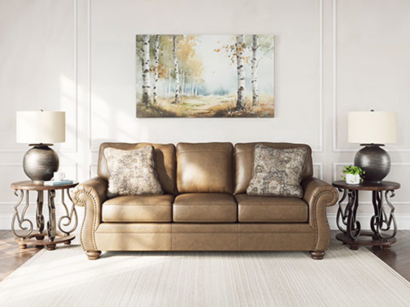 This beautifully crafted sofa in rich, faux leather upholstery combines rustic charm with modern durability while plush cushions invite you to relax and unwind. Traditional rolled arms are highlighted by classic nail head trim, adding a refined touch of sophistication. Distressed chenille accent pillows enhance the texture and visual appeal and the turned wooden legs complete the look with a nod to heritage craftsmanship.