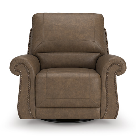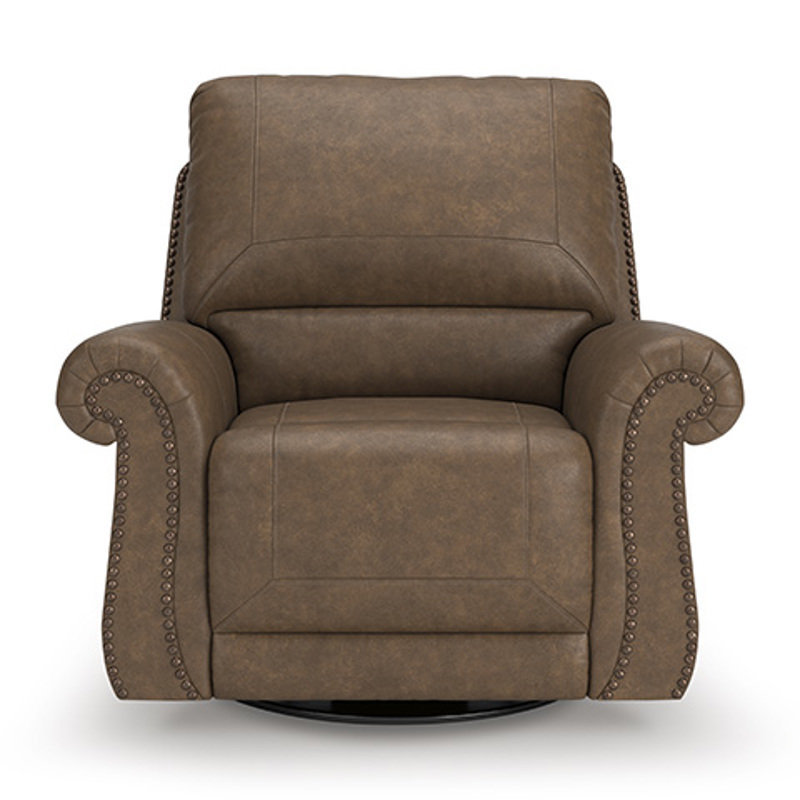 This beautifully crafted recliner in rich, faux leather upholstery combines rustic charm with modern durability. The recliner's comfy, durable cushions—wrapped in a rustic yet sophisticated faux leather—keep you feeling relaxed, while its turned legs show that style and quality flow from top to bottom. Plus the smooth reclining motion and 360-degree swivel keep you in the flow of conversation.