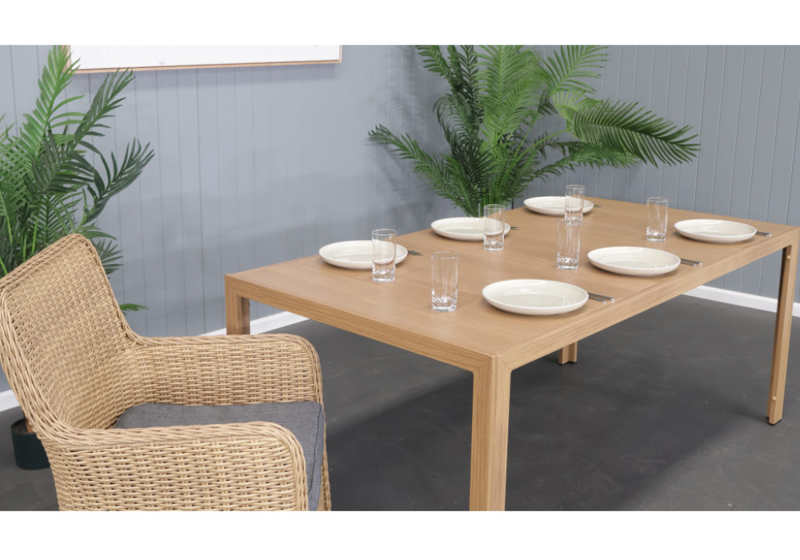 Crafted with a sleek aluminum frame and a stylish teak-look finish, it offers the perfect balance of strength and sophistication. The chairs feature high-quality PE wicker, known for its durability and is paired with plush, water-resistant fabric cushions for ultimate relaxation.