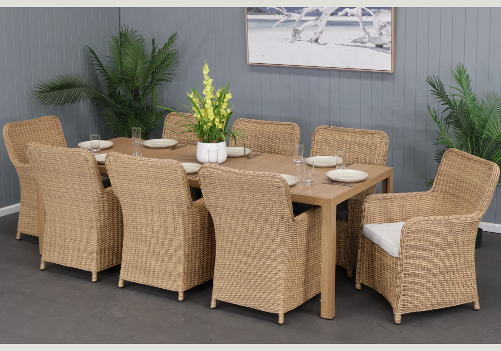 Transform your outdoor space with the elegant Capricorn Outdoor Dining Suite. This stunning 9 piece set is designed to complement any décor, combining modern aesthetics with superior comfort and durability.