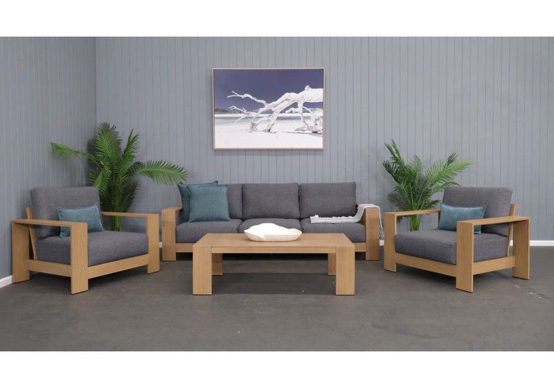 Crafted with a sleek aluminum frame and a stylish teak-look finish, it offers the perfect balance of strength and sophistication. The chairs are paired with plush, water-resistant fabric cushions for ultimate relaxation.