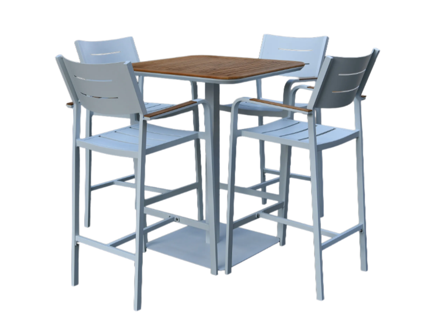 Enhance your outdoor area with the Corsica Outdoor Bar Setting, a perfect blend of style and functionality for casual dining or entertaining. This set includes a sleek bar table and four comfortable bar chairs, all crafted from high-quality aluminum with a white powder-coated finish and durable teak slats. The combination of these materials ensures a rust-resistant, weather-resistant, and low-maintenance design that will remain a staple in your outdoor space for years to come.