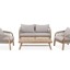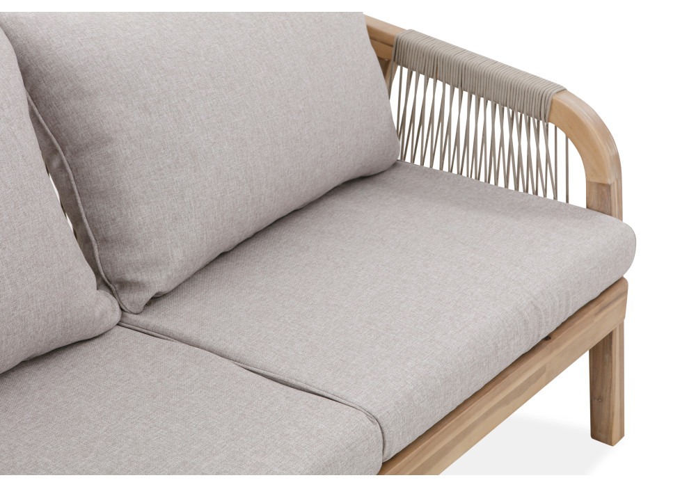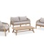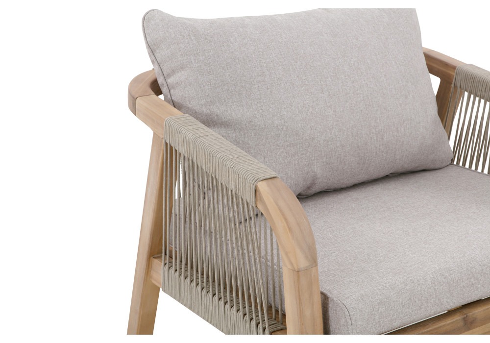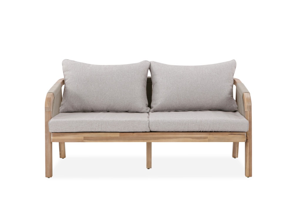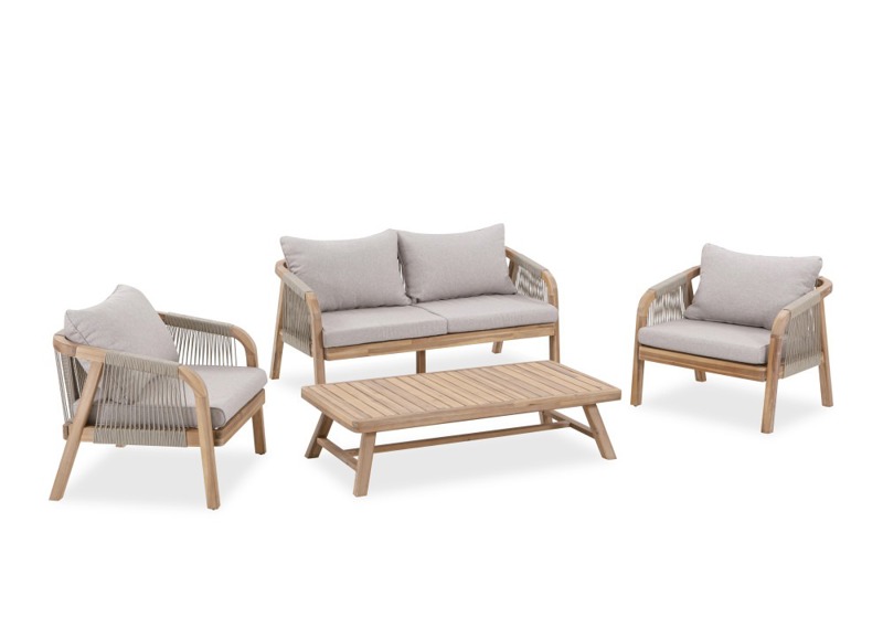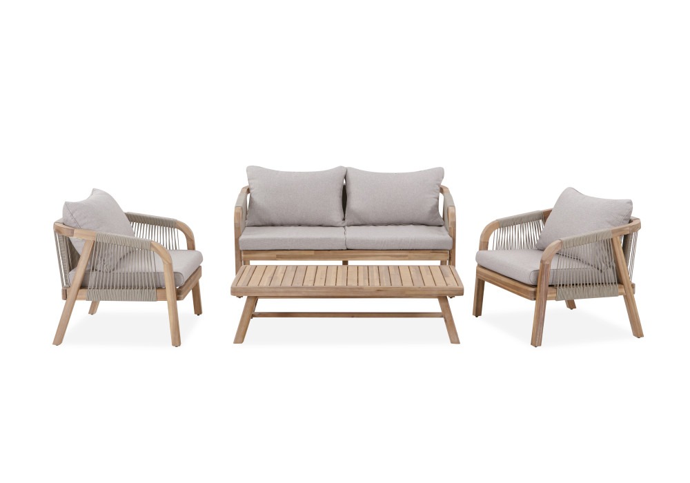 This Coffee Table set is sure to turn heads with its beautiful, sleek Acacia wood design and natural timber look. The chairs feature soft, ivory-grey cushions and a rope overlay to provide character.