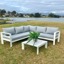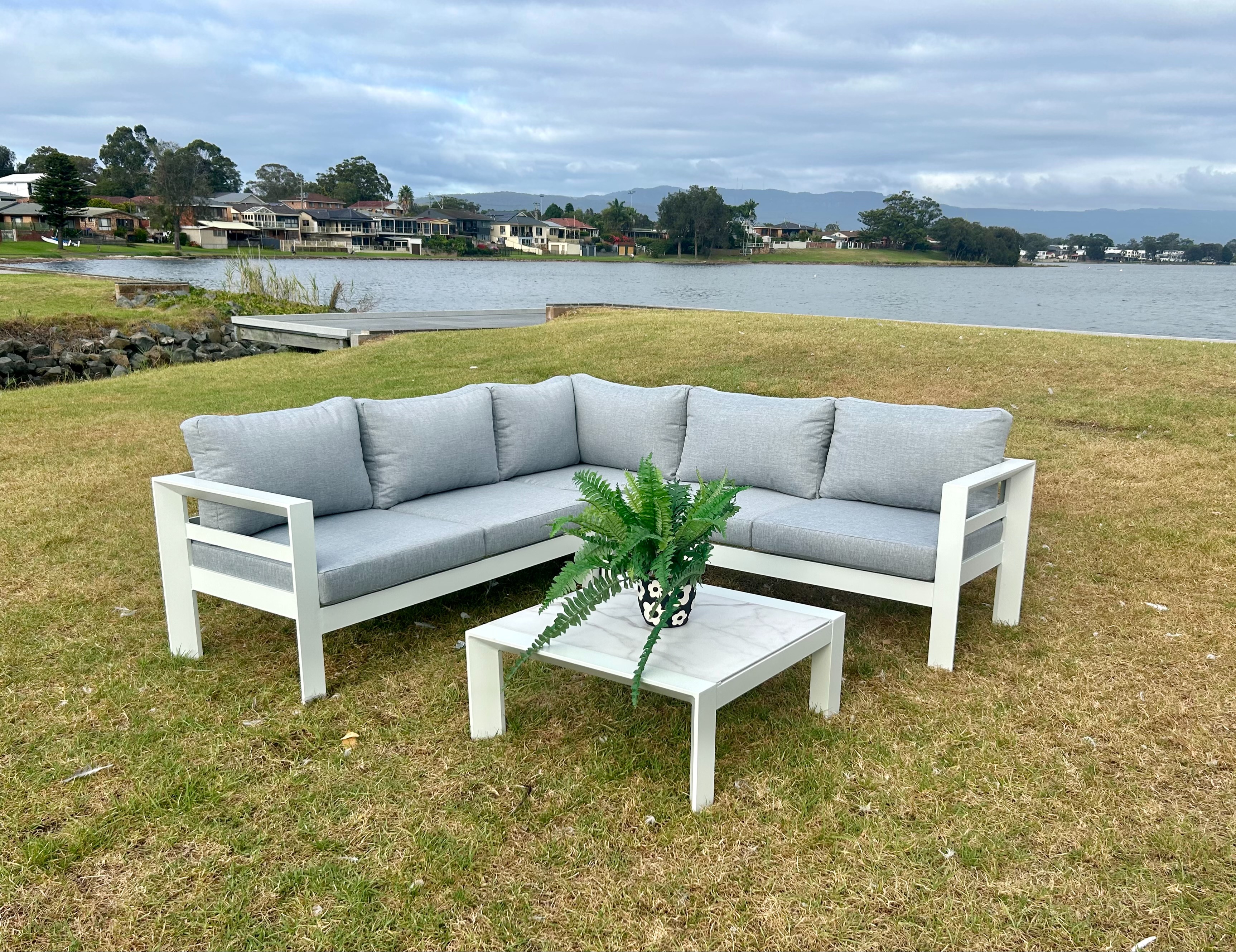 The Portsea Outdoor Corner Lounge Setting offers a sophisticated and versatile design, perfect for larger outdoor areas or patios. This set includes a 3-seat sofa, a 2-seat sofa, and a stylish coffee table. Featuring a durable aluminum frame, light grey cushions, and a sleek off-white marble print tabletop, it’s the ideal choice to elevate your outdoor living space with comfort and modern appeal.